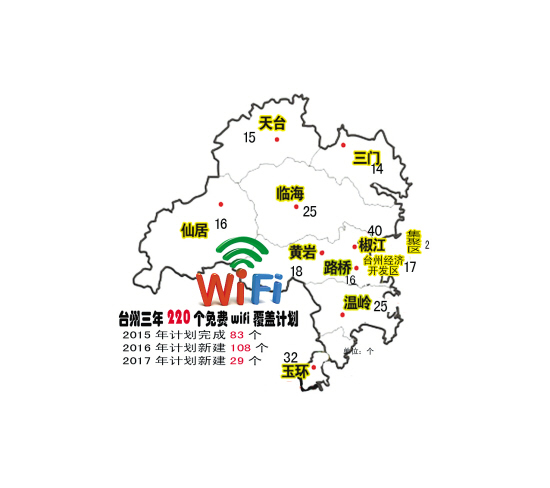 昨日,记者从市经信委获悉,台州三年免费WiFi行动计划出台。根据该计划,到2017年底,台州将在县级及以上城市的公共服务场所和公共区域实现免费WiFi全覆盖。