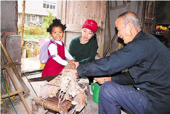 斯蒂芬一家三口帮助老人收稻子、挖红薯,茱莉性格活泼,擅长歌舞,常常逗得爷爷奶奶捧腹大笑。“看看义工们在做什么,是对她最好的教育。”斯蒂芬说。