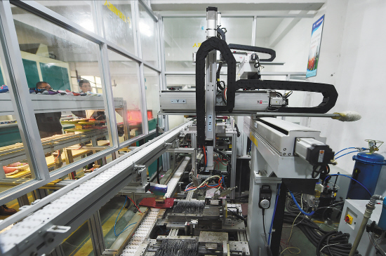 11月17日,台州市博洋鞋业有限公司自动化车间内,机器人在喷胶线加工鞋垫。目前,该企业正加快转型升级,提高市场竞争力,投资600多万元引进了机器人自动化生产线加工运动鞋,不仅提高了产品质量、降低材料消耗,还提高了工效47%。