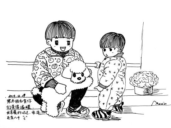 黄岩一位80后妈妈将儿子的成长点滴手绘成漫画,画中有可爱的兄弟俩,还有一只“汪星人”。这位妈妈有个美好的愿望:“将来儿子婚礼上,要播放我的漫画” 。