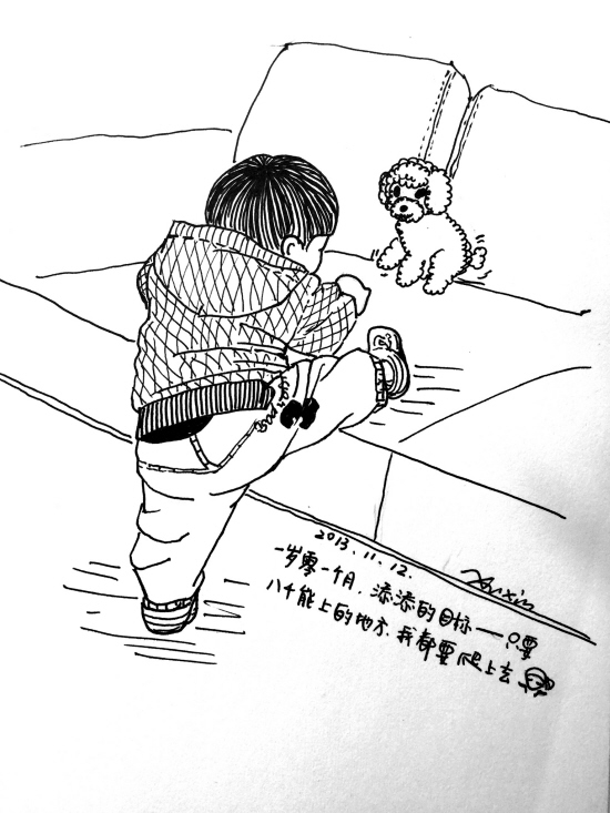徐昕平时就喜欢随手画些东西,有了儿子之后,她随手画的画中就多了孩子的身影。“刚开始只是随手画了几张漫画,我老公看到说我画得挺好的,干嘛不继续画下去。我也觉得挺有意义的,就越画越多了。有的是写生,有的是根据照片画的。”