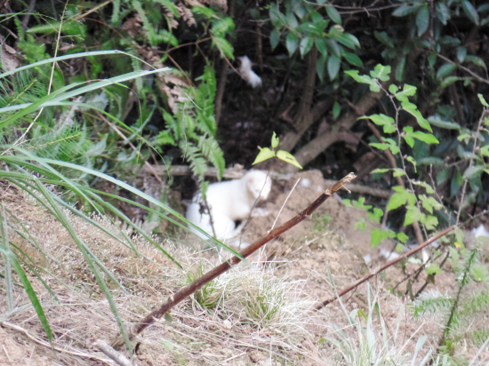也是凑巧,恰好有只白貂从树丛中探头探脑钻出,也不怕人,似乎是因饿极了,从黄土堆里刨出一条兽腿试图拖走。记者上前拍了几张照片,小白貂犹豫了一会儿,又小心退回到树丛中去。