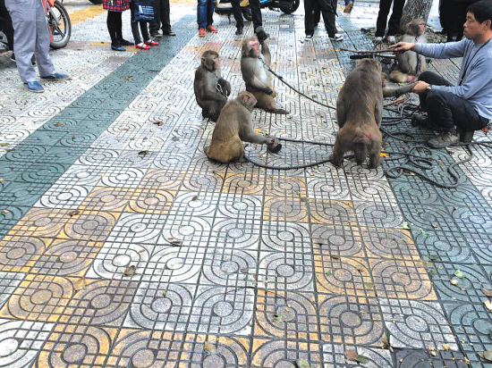 “还有一位中年妇女,给了10元,耍猴的同伴一边捏着一沓钱,一边嫌少,围着她说,多给点吧!”洪先生说,他们要钱的时候很霸道,不给就不让走,还专挑妇女要钱,等人家害怕了就只好掏钱了。
