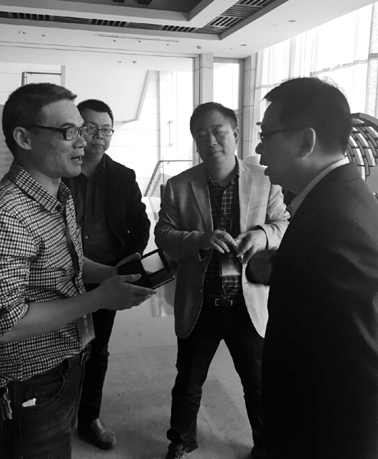 会议茶歇期间,重高校长围着北大浙江招生组组长李祎(右一)推销本校的优秀学生。记者梁建伟/摄