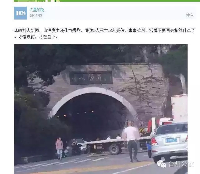 事件发生后,网友“火星的兔”在108社区论坛上发布了内容为“温岭特大新闻,山洞发生液化气爆炸,导致5人死亡3人受伤”的虚假信息,同时附了1张照片。随后该虚假信息被转发扩散,引发公众关注。