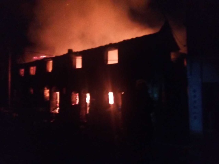 22点10分,三门大队到达现场。只见5间连体石木老房失火,火光冲天,所幸现场无人员被困。