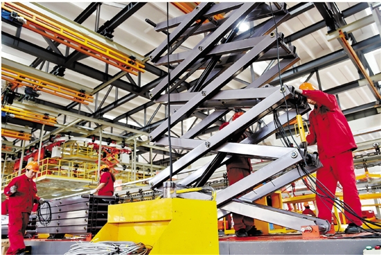 浙江鼎力机械股份有限公司车间里,工人在装配生产线上作业。该公司主要产品有自行走和高空取料平台等6大系列80多个规格的高空作业平台。(资料照片)记者梁臻摄
