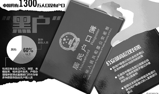 单独就中国的户籍制度来说,“黑户”一词就是在全国人口普查中没有户籍资料,没有户口卡(常住人口登记卡),并没有身份证的人。相关统计显示,总量在1300万左右、占总人口1%的中国人是“黑户”,这已经成为一个影响社会公平、和谐的重大问题。