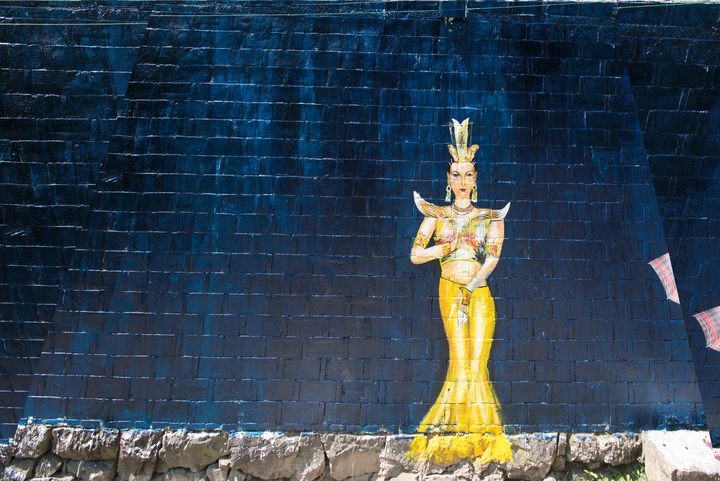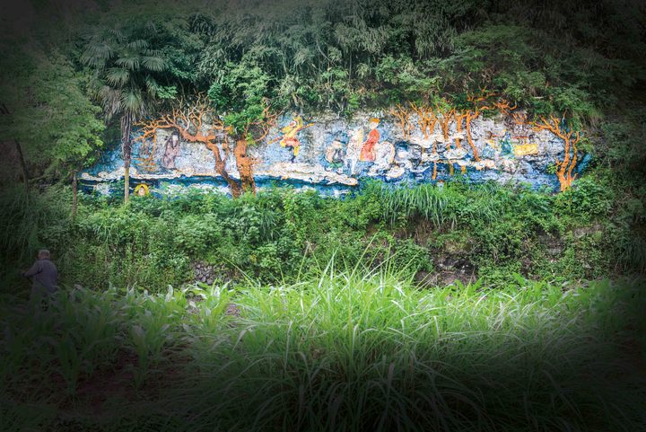 几幢浓墨重彩的小楼,墙体已被好几种涂鸦覆盖,动物、人像、标语等等,看似随意有趣,走近了就会发觉其实画功都挺了不得。不止墙面,金满坑村的水渠护坝、电线杆子、石筑围栏也被涂刷成五颜六色;陶罐、瓦罐被画上眼耳口鼻,表情挺喜感;就连村口的公共厕所,男女入口也通过涂鸦头像来呈现,粉红、明黄、天蓝交织,缤纷了满山青绿。