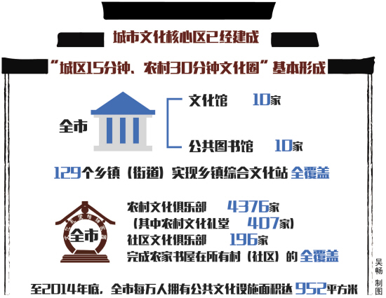 截至2014年末,全市建成国家一级文化馆7个,二级2个,国家一级公共图书馆4个、二级5个,免费开放的民办博物馆24个,剧院(电影院)19个,乡镇综合文化站和农家书屋均已实现全覆盖,公共文化设施总面积近60万平方米。