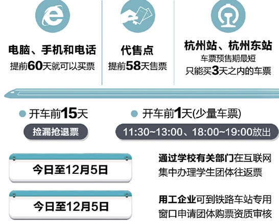 从12月11日起,没有参加院校统一办票的学生,还可通过网络、手机客户端、电话、车站窗口、代售点、自动售票机等渠道,购买1月10日至2月29日间的学生往返票。