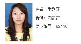 姓名:米秀媛省份:内蒙古网点编号:62116