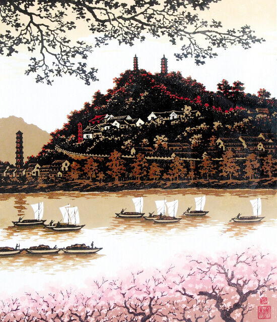 巾山夕照江南三月绽桃花,灵水扬帆向海涯。举目巾山群塔立,夕阳灿灿染烟霞。