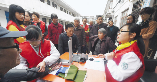 12月5日是第三十个国际志愿者日。当日,路桥区路桥街道妇联组织近20位巾帼志愿者,来到商城社区,开展“邻里守望、姐妹相助”巾帼志愿者服务活动,为居住在这里的“空巢”老人、困难老党员及生活不便老人,提供健康检查、洗衣洗被、心理咨询等服务。图为工作人员在为老人免费检查身体。