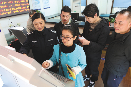 日前,台州市公安局黄岩公安分局出入境管理大队民警正在指导市民使用出入境证件自助办理系统。该大队深入开展“优服务、创满意”活动,优化服务流程,明确服务时限,受到了群众好评。