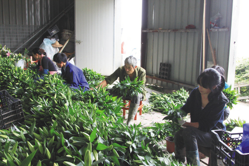 圣诞节临近,鲜花随之热销。12月21日,在黄岩区院桥镇的台州市富景鲜花生产基地内,工作人员正在忙着分拣百合花,等到包装后销往市场。据该基地负责人介绍,大棚内现有百合70多万株,随着圣诞节临近,百合花需求看涨。目前,他们的百合花以每株5元的批发价,被销往北京、西安、武汉、常州、南京、上海、杭州、温州等地市场,日销量达2万多株,比平时销售增加了一倍。