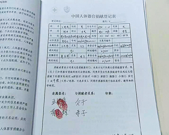 王俊凯爸爸签下的捐献登记表