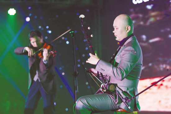 12月28日,我市著名二胡演奏家张旋(右)和著名企业家、市政协特聘委员李谷(左)用二胡和小提琴共同演奏《梁祝》,为观众献上了一场融合中西特色的视听盛宴。当天,我市11家单位共同举办的“践行社会主义核心价值观、展望十三五共筑中国梦”元旦晚会在台州电大举行。