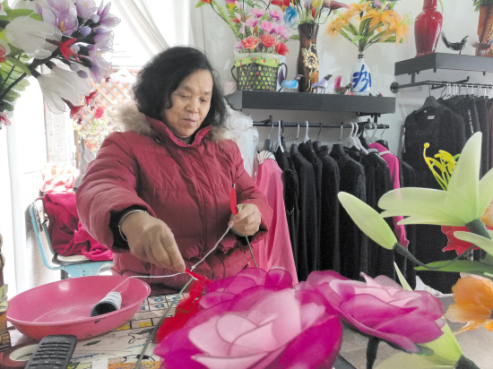 初学丝网花,陈文英遇到不少困难,就借着买材料的时机,到附近的花店讨教,还自己上图书馆和新华书店,找有关制作丝网花的图书,“后来,咱们县里开了免费的丝网花培训班,我儿子帮我报了名,我这才算入了门。”
