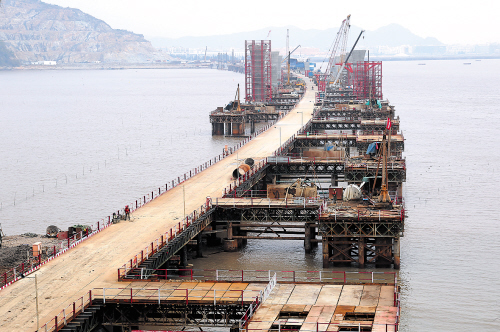 据了解,作为沿海高速公路乐清湾大桥及接线工程重要标段的吊船湾大桥,由中铁四局二公司承建,桥梁全长1557米,起点在玉环县沙门镇大沙湾村,终点与该镇乌岩山相接。倪建军摄