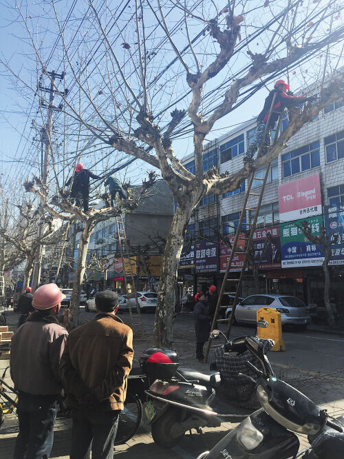 据园林管理处工作人员介绍,树木种植多年,如今树杈长高,多与半空中的高压线“纠缠”在一起,形成了一定的火灾安全隐患,所以才予以修剪。此次,他们将修剪路桥16个街道的此类树木。目前,路桥镇中路一带靠近高压线的树木已于近日连夜修剪完毕。