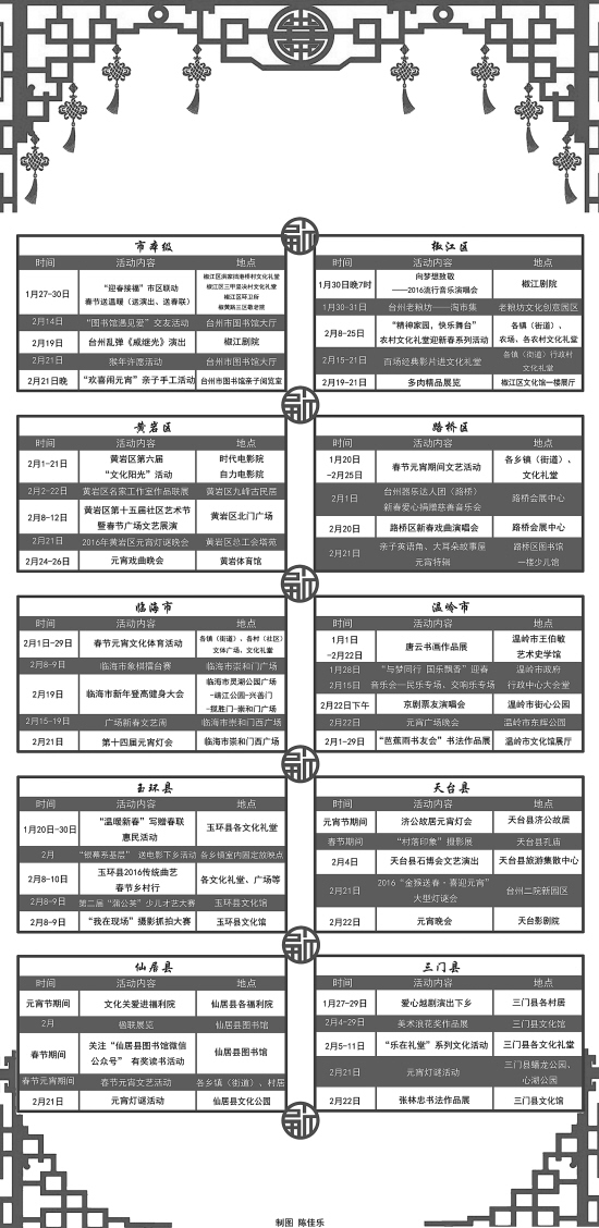 春节期间,台州的文化活动很赞哦,丰富的讲座展会、激情的广场活动、传统的花灯灯谜等系列群众文化活动将轮番上演。