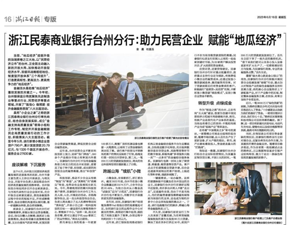 小微金改,全国看浙江,浙江看台州。截至2022年底,台州市在册小微企业数量达到23.74万户,占全市企业的91.48%。为助力台州从小微金改“试验区”迈向“示范区”,民泰银行台州分行也不断发力,用数字化手段提供更优质的金融服务。