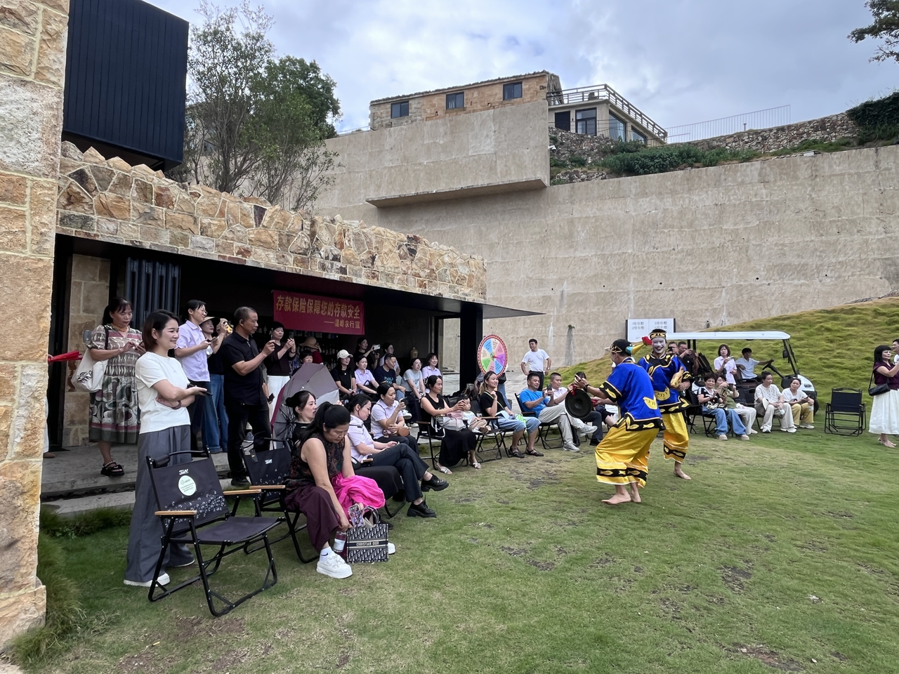 活动以热情洋溢的代表性非遗——大奏鼓表演拉开序幕,“中国渔村第一舞”舞蹈动作粗犷滑稽,男性舞者身着女装表演,独具特色,引得客户们目不转睛,同时也吸引了多名游客驻足观看。