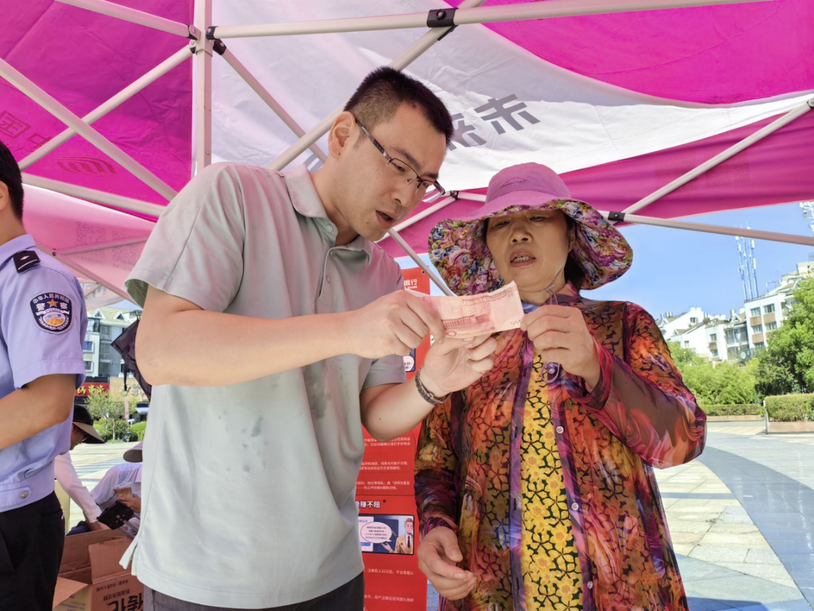 反假货币宣传环节,该行副行长章晨炜展示不同面额假币关键特征,手把手传授 “看、摸、听、测” 识别方法,以现场问答互动的方式激发群众热情,有效提升公众识假防假能力。