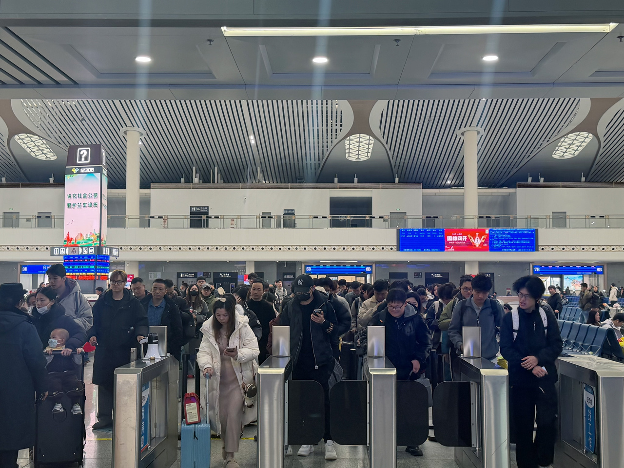 台州铁路和民航的返程大幕已全面拉开,旅客们拖着行李步履匆匆,在检票口闸机前有序排队。