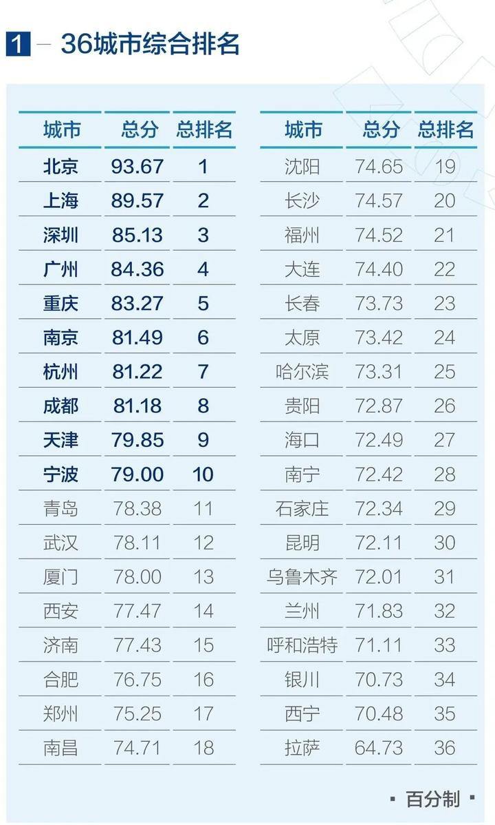 北京、上海、深圳、广州、重庆、南京、杭州、成都、天津、宁波在综合评价排名中位列前十。