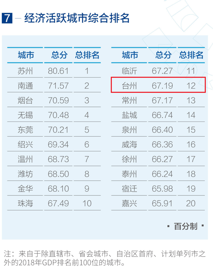 在经济活跃城市的营商环境综合排名中,苏州、南通、烟台、无锡、东莞、绍兴、温州、潍坊、金华、珠海位列前十,其中,台州位列第十二名。