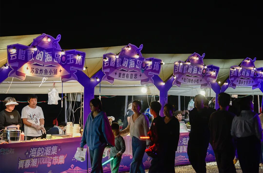 海韵潮集·青春潮YOUNG市集是本次大赛的一大亮点。这里既有玉环本土的特色小吃,如滋滋作响的油鼓、裹着芝麻甜香的油索、在沸水中浮沉的鱼皮馄饨等,让游客品尝到地道的海岛美食;也有展现传统技艺、海韵玉环的非遗及文创和“鲜玉奇缘”摊位,让前来参赛的大学生选手和闻讯而来的市民游客们在欣赏音乐的同时漫步市集,感受不一样的休闲体验和玉环味道。