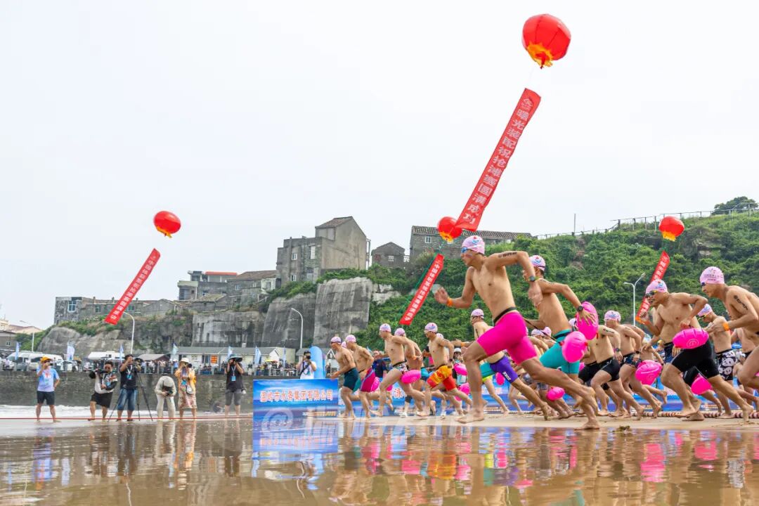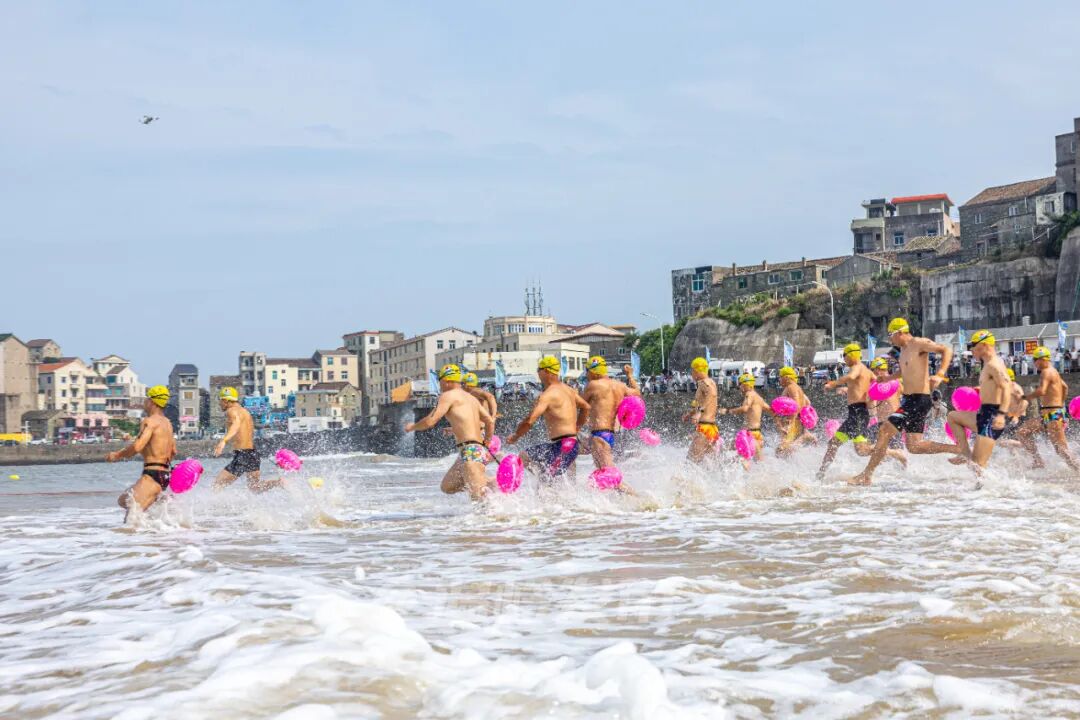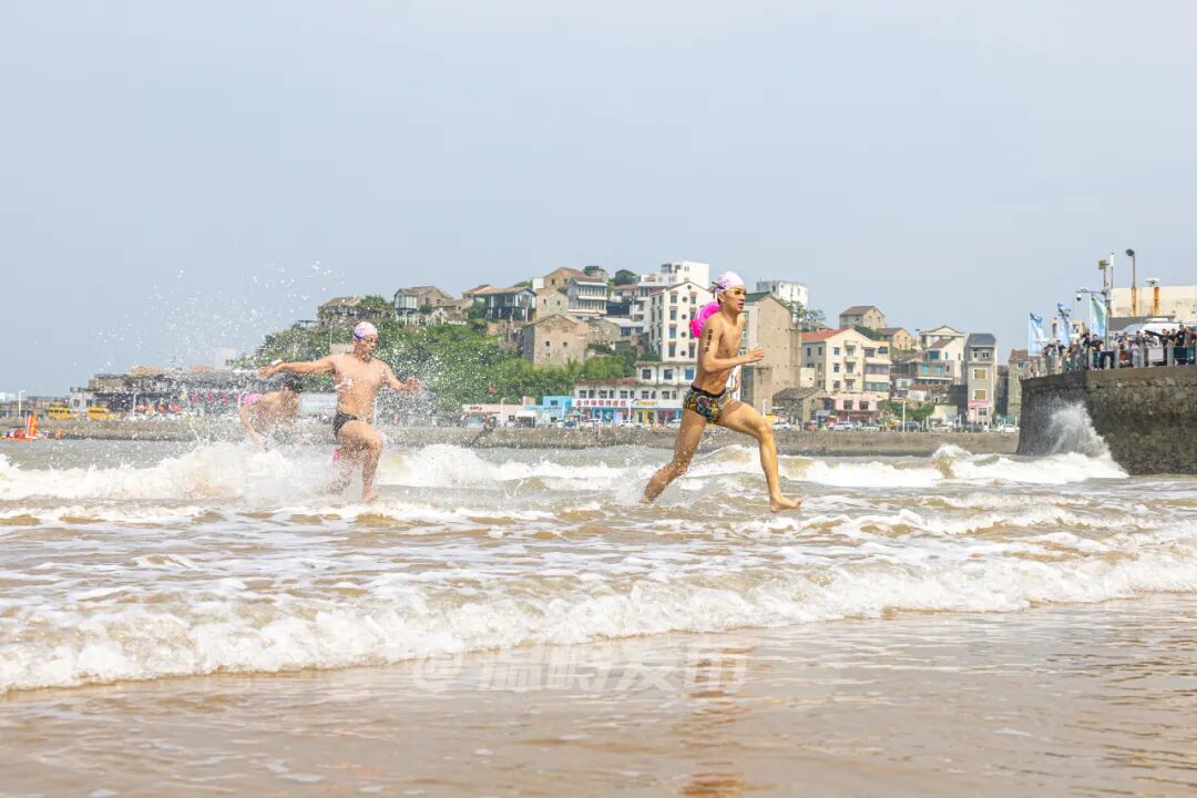 随着发令枪响,选手们越过沙滩,冲入海中。他们或以自由泳劈波斩浪,或以蛙泳蓄力前行。
