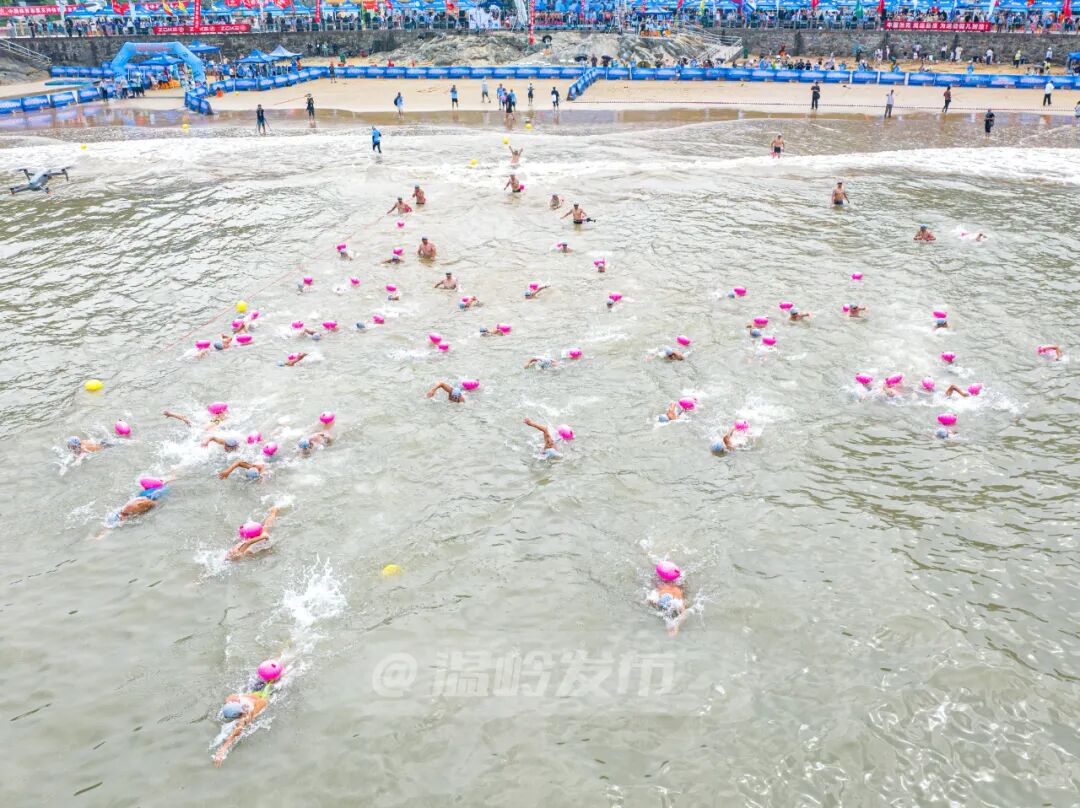 “山海泳士 向阳而生”中国体育彩票·曙光装配·2025温岭黄金海岸抢滩赛鸣笛开赛,吸引了来自浙江、安徽、香港等全国各地的1000多名游泳运动员一起在碧海中畅游争勇,感受山海风情。