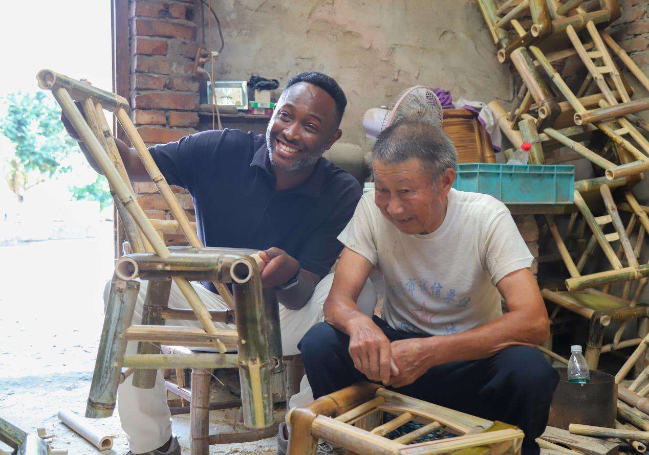 在王普法的帮助下,帕斯卡亲身体验了竹椅的制作,当竹管在铁凿的敲击下一点一点嵌入竹椅中,直至严丝合缝,成就感油然而生。