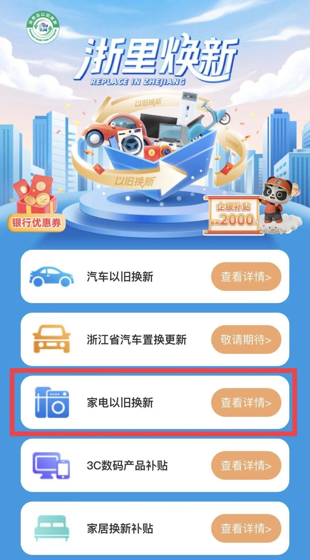 通过云闪付“浙里焕新”小程序,点击“家电以旧换新-查看详情”进入所在地区家电以旧换新补贴活动详情页面,消费者可通过点击右上角切换活动地区。