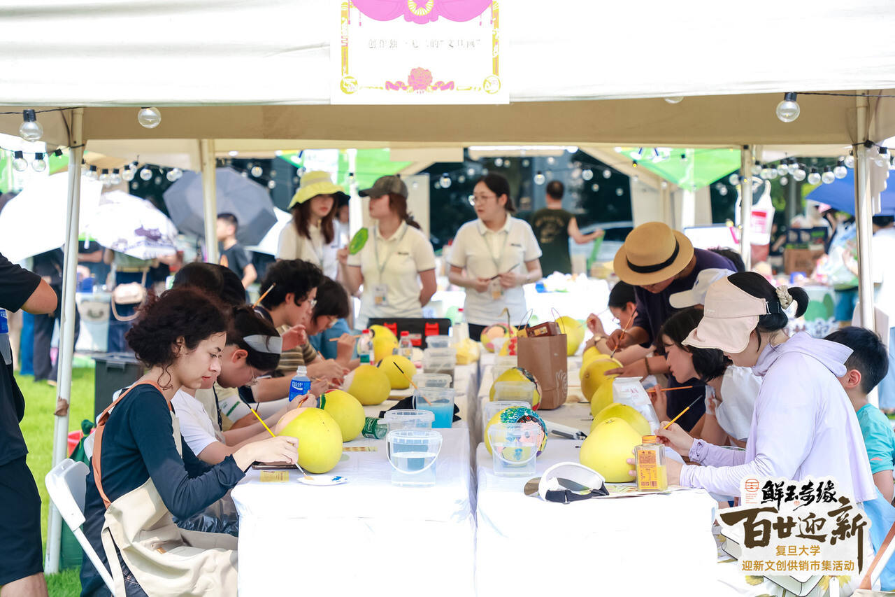 “鲜玉奇缘”“十二时辰”主题快闪活动,通过亲手创作、亲口品尝,让复旦师生亲身感受玉环的独特魅力,成为全场焦点。未时的“文旦画创作”,师生在新鲜文旦果皮上勾勒节气符号与校园风景,让农产品变身 “艺术载体”;申时的“文旦香”漆扇 DIY,扇面浸润文旦精油、题写“鲜玉奇缘”字样,传统漆艺与地方特产碰撞出独特韵味;酉时的“玉环小吃工坊”,手艺人现场教学“鱼面敲制”过程,实时蒸煮番薯圆、鱼皮馄饨等玉环特色小吃,让新生在动手实践中感受非遗美食文化,还能一口尝到山海之间的鲜甜;戌时的“文旦饮品品鉴会”,咖啡师精心研制的文旦果咖、文旦冰茶等创意饮品,为夜晚的市集增添清甜气息。