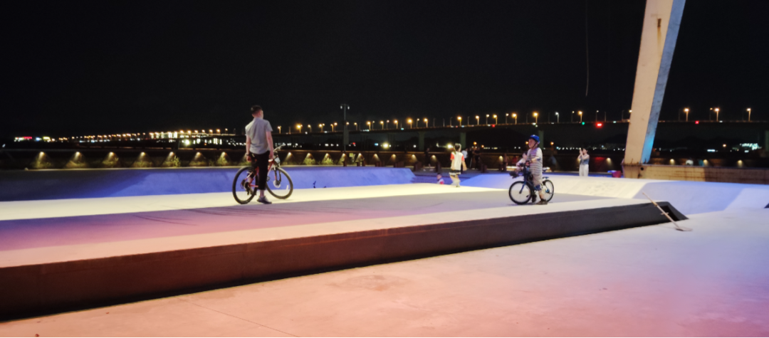 还有龙门驿站,不仅有适合跑步、散步的钢结构平台,还有适合滑板、轮滑的场地。夏日的傍晚,随处可见许多热爱滑板、骑车运动的年轻人,年轻矫健的身影与江岸边的璀璨灯光相互交织,共同绘制出一幅青春活力的滨江画卷。