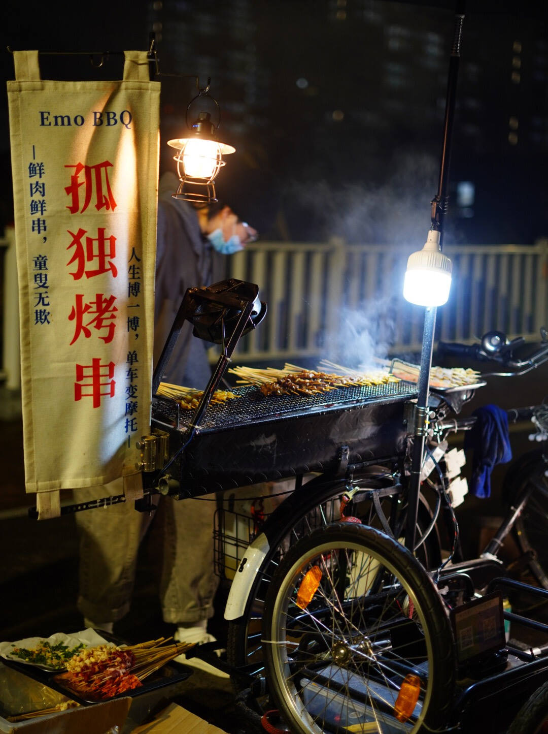 广告灯被安装在车把手下方,“孤独烤串”几个字明晃晃的,“就是我一个人孤独地在烤炉前烤串”,她说。