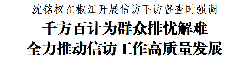 9月29日上午,台州市委书记沈铭权在椒江区开展信访下访督查。他强调,要深入学习贯彻习近平总书记关于加强和改进人民信访工作的重要思想,紧扣“4+1”重要要求,贯通落实省委“132”总体部署和王浩书记对台州“五方面要求”,聚焦聚力三大牵引性抓手攻坚年活动,坚决扛起为民解难、为党分忧的责任,全力推动信访工作高质量发展。市委常委、秘书长陈挺晨参加。