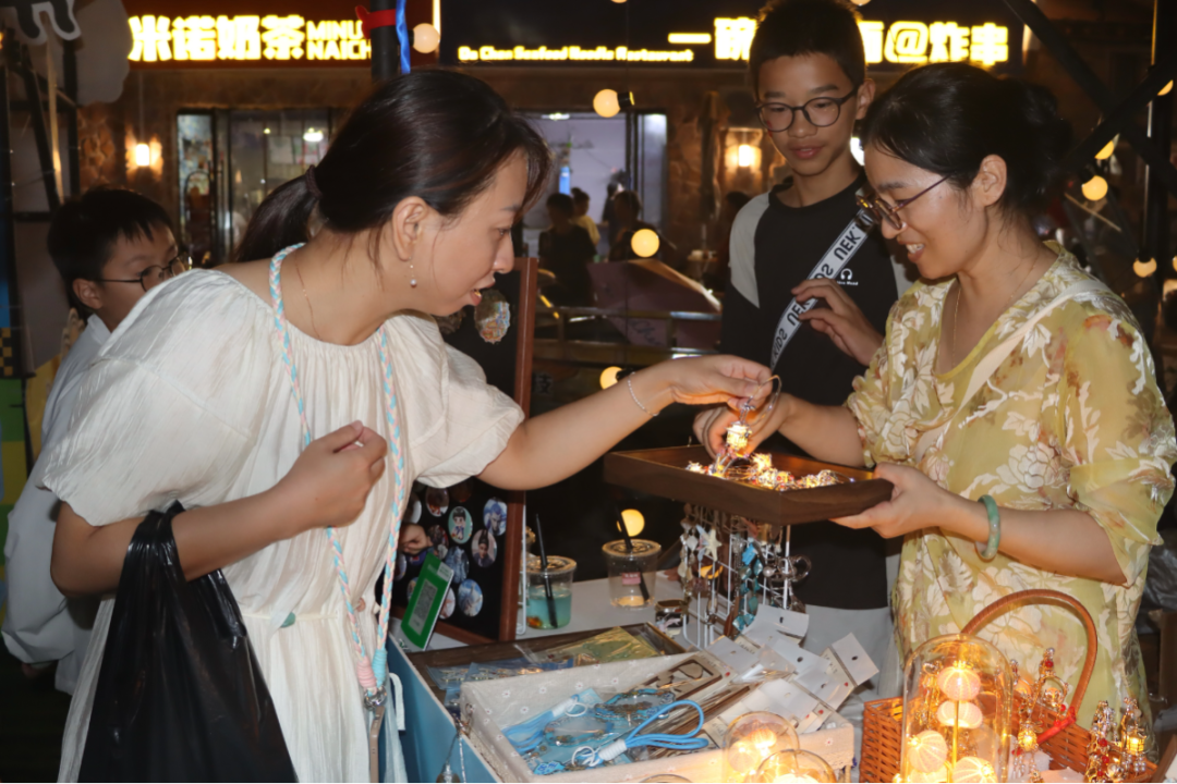 同一时段,不远处的露天影院放映着电影,海风集市的摊位前也挤满了人群,海岛风情的文创产品、海岛特色美食,吸引不少游客前来购买。
