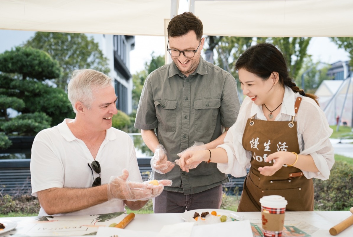 月饼DIY体验区,来自不同国家的的海外传播官与海外友人沉浸式感受中华传统民俗。从聆听中秋“团圆”文化渊源,到亲手揉制面团、包裹馅料,尽管动作略显生涩,却在糕点师的指导下完成了造型各异的月饼。团圆宴期间,文化与美食在此交汇,海外传播官们围坐在热气腾腾的台州姜汤锅旁,被辛辣暖胃的姜汤和鲜甜的本地海鲜征服。“通过指尖的温度,我读懂了中国‘家’文化的深层内涵。”大家纷纷感慨。