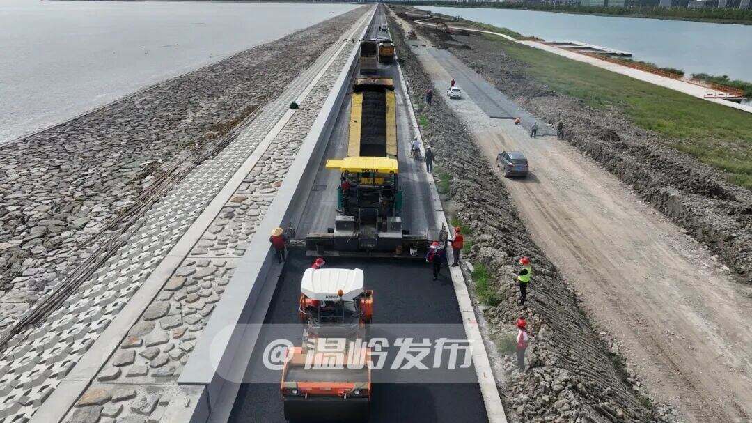 国庆中秋长假期间,温岭市海塘安澜工程(东部新区海塘)施工现场一片热火朝天的景象,闸口广场基础钢筋绑扎作业与堤顶道路沥青铺装同步推进。