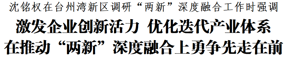 沈铭权在调研中强调,台州湾新区是全市高质量发展的主阵地,要以三大牵引性抓手为重要载体,强化创新引领、深化改革攻坚,持续推动“两新”深度融合不断取得新突破。要强化企业创新主体作用,支持企业与高校、科研院所共同组建创新联合体,健全协同攻关、联合创新机制,推动产业链上下游联动、大中小企业融通创新;要加快产业体系优化迭代,深化“腾笼换鸟、凤凰涅槃”,支持企业强化数智技术和绿色低碳技术运用,统筹推进传统产业优化升级、新兴产业培育壮大、未来产业前瞻布局,加快形成新质生产力最活跃的先导力量;要优化科技创新生态,扎实推进教育、科技、人才工作深度耦合、相互赋能,完善存量资产变科创空间的支持政策,探索耐心资本长期投入新机制,营造支持全面创新的良好氛围。