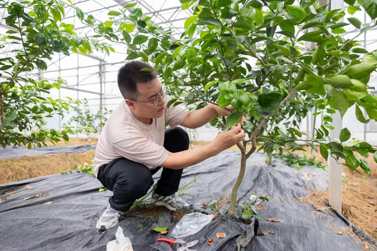 在江对岸的种源中心10号大棚,来自华中农业大学的全国柑橘体系岗位科学家解凯东正带着学生进行嫁接。这里是细胞工程育种的实验基地,共种植着600多个柑橘品种。