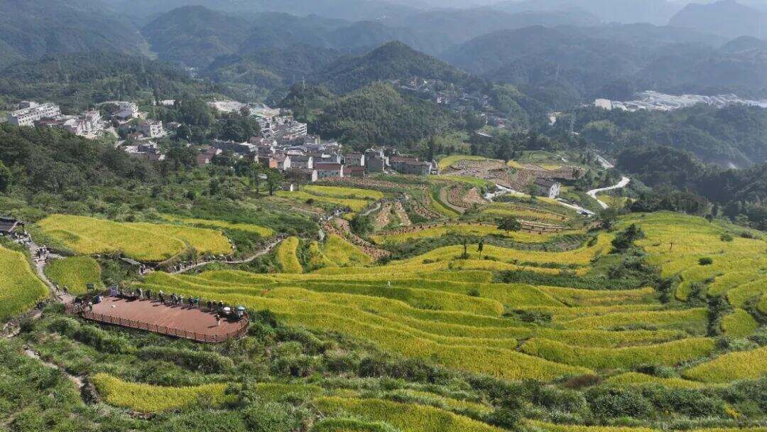粒粒泳溪米,深深丰收情。近年来,泳溪乡通过系统谋划,持续保障农业各作物种植规模,农业特色产业增长势头强劲。据泳溪乡相关负责人介绍,“今年全乡香米种植面积3900多亩,香米总产量今年预计增产5%。”同时,泳溪乡加快农文旅融合发展建设步伐,以北山鎏金梯田为突破口,做大“一粒米”共富文章,为乡村振兴注入多元的游客能量和澎湃的产业力量。据统计,2025年国庆中秋假期泳溪北山鎏金梯田游客火爆,共接待客流量2.3万人次,总体实现旅游消费25万元,带动农家乐、住宿、漂流等周边消费86万元。