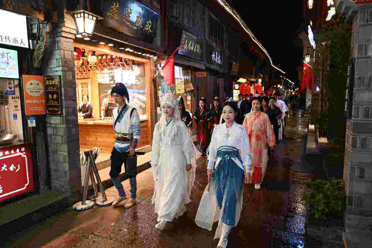 国庆假期里的天台赭溪老街人头攒动,不少游客是冲着飞天秀去的。夜色中,赭溪老街的“鹊梦赭溪”真人飞天秀2.0版重磅回归,飞天仙子衣袂翩跹,在赭溪上空演绎嫦娥奔月、牛郎织女、鲲鹏展翅等神话场景。