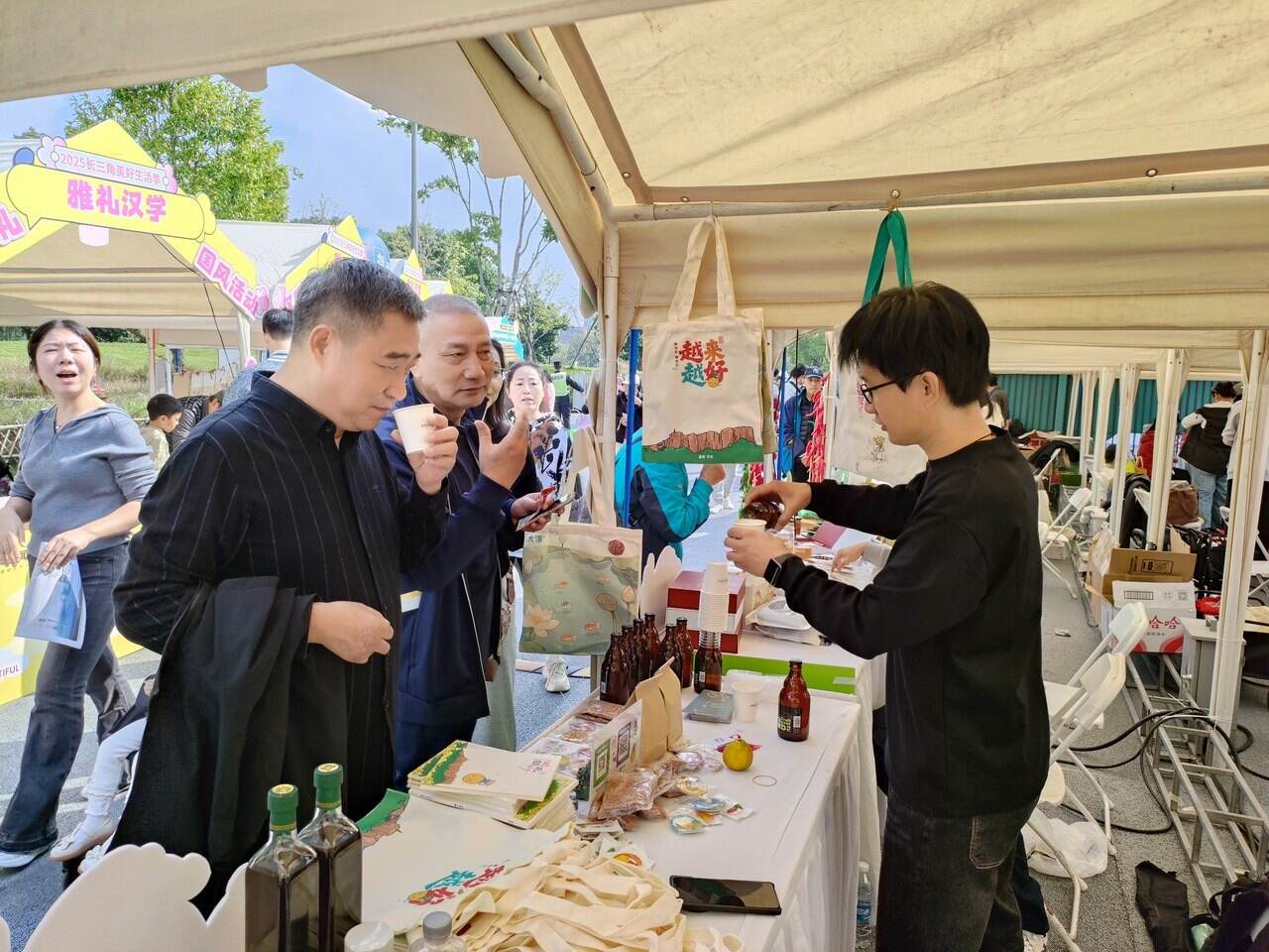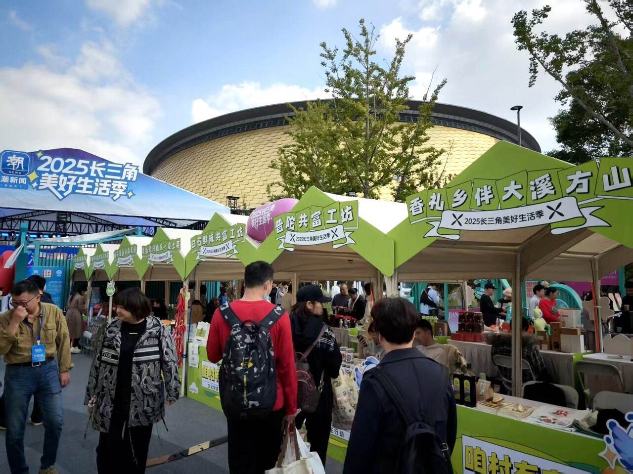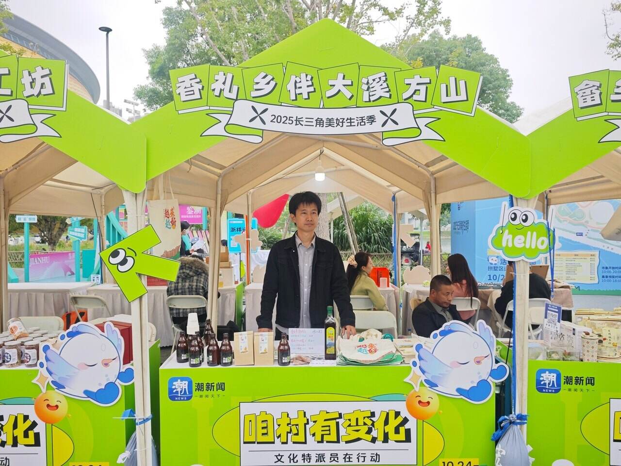 10月24日至26日,杭州拱墅区运河体育公园内的“2025年长三角美好生活季”市集上,台州市文化特派员谢法标带来的方山村文创展台前人头攒动。