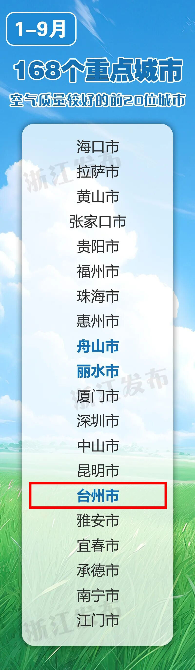 1-9月,168个重点城市中,空气质量较好的前20位城市浙江占3席,分别是舟山、丽水和台州。